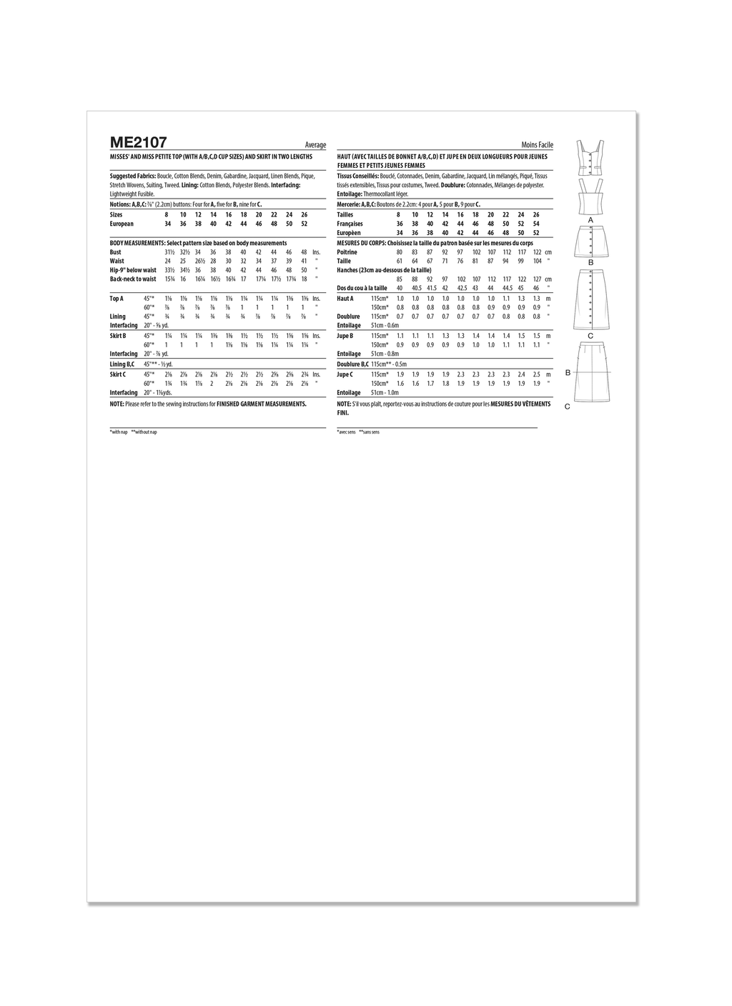Ensemble de modèles de haut et de jupe coordonnés et ajustés. Le haut à larges bretelles a un décolleté en cœur, des coutures princesse, une fermeture boutonnée sur le devant et des poches passepoilées. Les jupes de longueur mini ou midi se ferment par un bouton sur le devant, ont des pinces dans le dos et des poches dans les coutures latérales. Pièces de patron séparées pour les bonnets A/B, C, D.