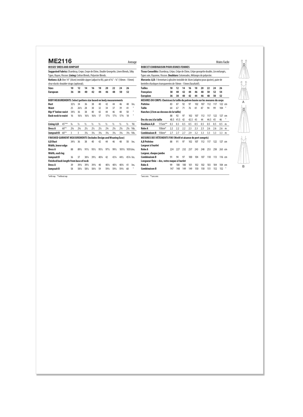 La robe à nouer sur le devant et la combinaison à fronces amples ont un corsage ajusté, un dos bas, des coutures dans le dos, des poches sur les coutures latérales et une fermeture à glissière invisible. La robe du modèle A a des attaches aux épaules. La combinaison du modèle B a des bretelles.