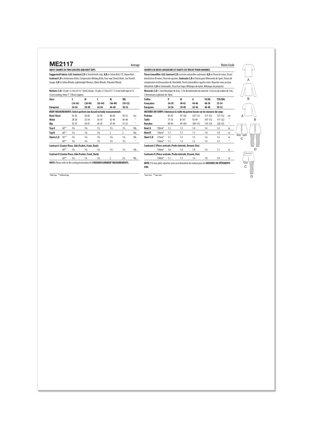 Modèles de hauts en tricot à manches raglan, courtes ou longues. Les shorts avec doublure intégrée ont une taille élastique, des attaches réglables sur le devant, des poches sur les coutures latérales avec fermeture éclair cachée et une poche arrière zippée pour les médias. Le modèle C est au-dessus du genou. Le modèle D mesure la longueur du mollet.