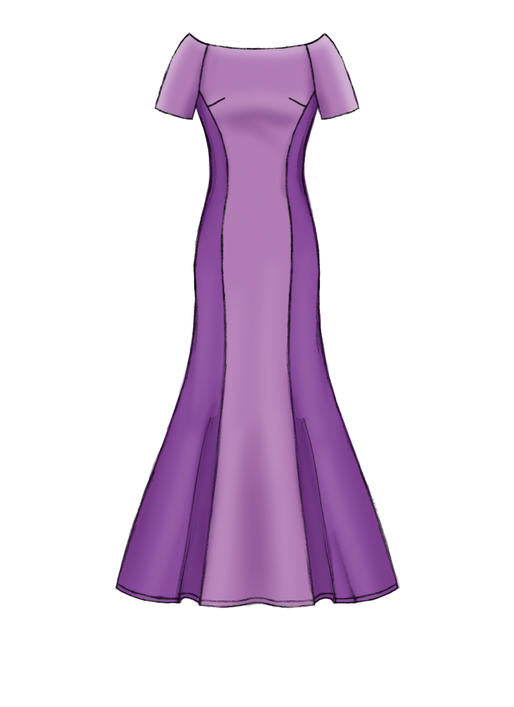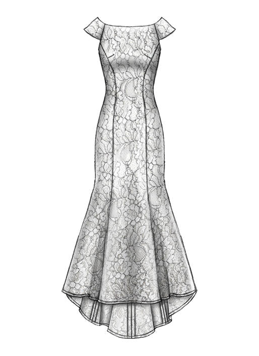 Robe doublée, au ras du sol, moulante sur la poitrine avec pinces, encolure entoilée, coutures sur le côté devant et côté dos, fermeture à glissière invisible au dos et variations de manche, de tissu et d’ourlet. C, D: Traîne.