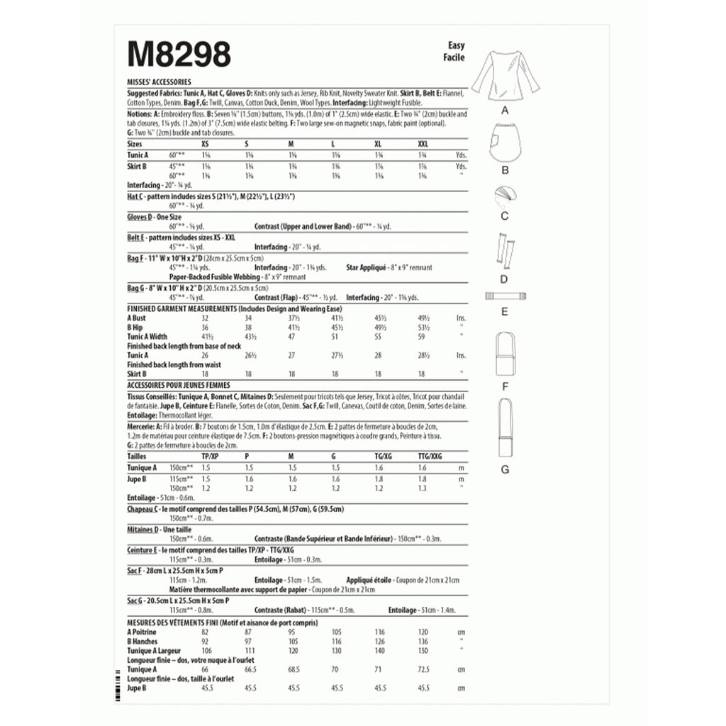 Tunique en tricot à col large et manches cloche extra longues avec des entailles avec des points de fil. Jupe à enfiler avec taille élastique, ourlet en pan de chemise, liens à nouer sur le devant, poche et bordure boutonnée. Bonnet en tricot ample avec détails rentrés. Large ceinture élastique avec pattes en tissu, fermetures à boucle et bordure en chaîne. Les gants longs sans doigts ont des bandes contrastées. Les sacs de style messager ont des rabats avec des fermetures en forme d'étoile ou de boucle peintes ou appliquées. Compétence en couture : Moyenne.