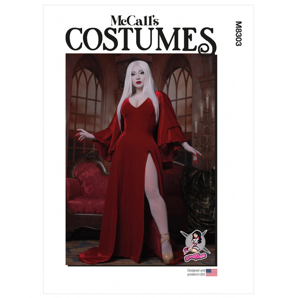 Robe dramatique entièrement doublée avec fentes sur le devant et décolleté profond. Le dos de la manche cape et la robe ont des fermetures éclair invisibles. Compétence en couture : Moyenne.