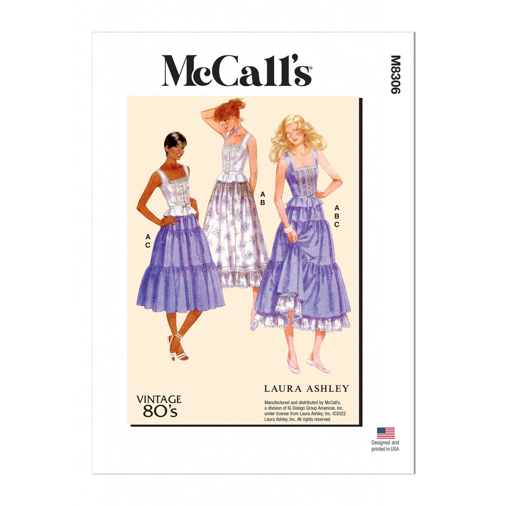 Années 1980 Vintage Laura Ashley. Haut boutonné ajusté, sans coutures latérales, avec plis sur le devant, bordure en dentelle, basque évasée et ceinture à la taille avec cordon de serrage en ruban. Les jupes ont des élastiques à la taille. La jupe B a des plis inférieurs, des volants avec un ruban et une bordure en dentelle. La jupe étagée C peut être portée par-dessus la jupe B. Fabriquée et distribuée par McCall's, une division de IG Design Group Americas, Inc. sous licence de Laura Ashley, Inc. © 2022 Laura Ashley, Inc. Tous droits réservés. Compétence en couture : Moyenne.