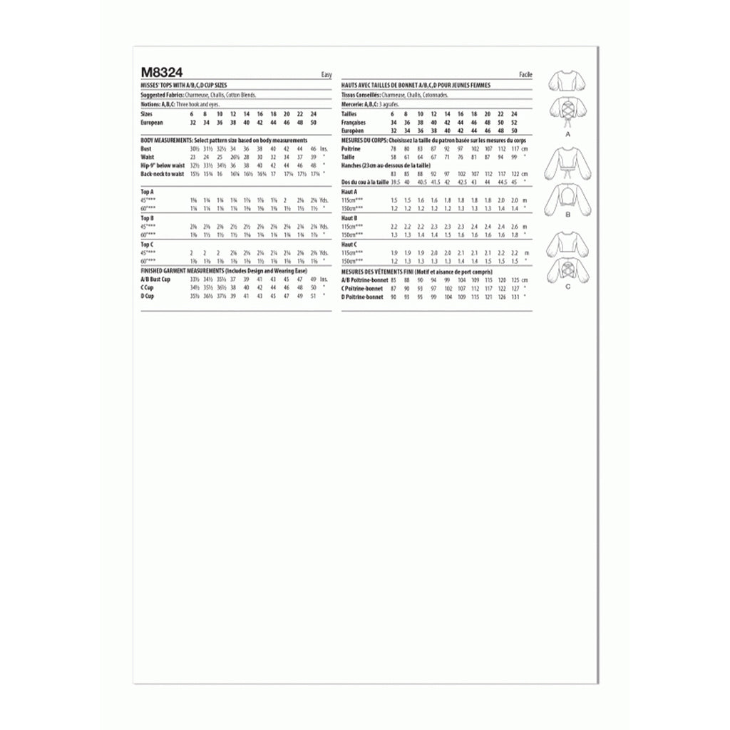 Haut dos ouvert à manches courtes, trois-quarts ou longues et ouverture à agrafes dans le dos. La version A a un laçage au dos. La vue B s'attache. La version C a des attaches entrecroisées dans le dos sur le devant. Pièces de patron séparées pour les tailles de bonnet A/B, C, D. Compétence en couture : Facile.