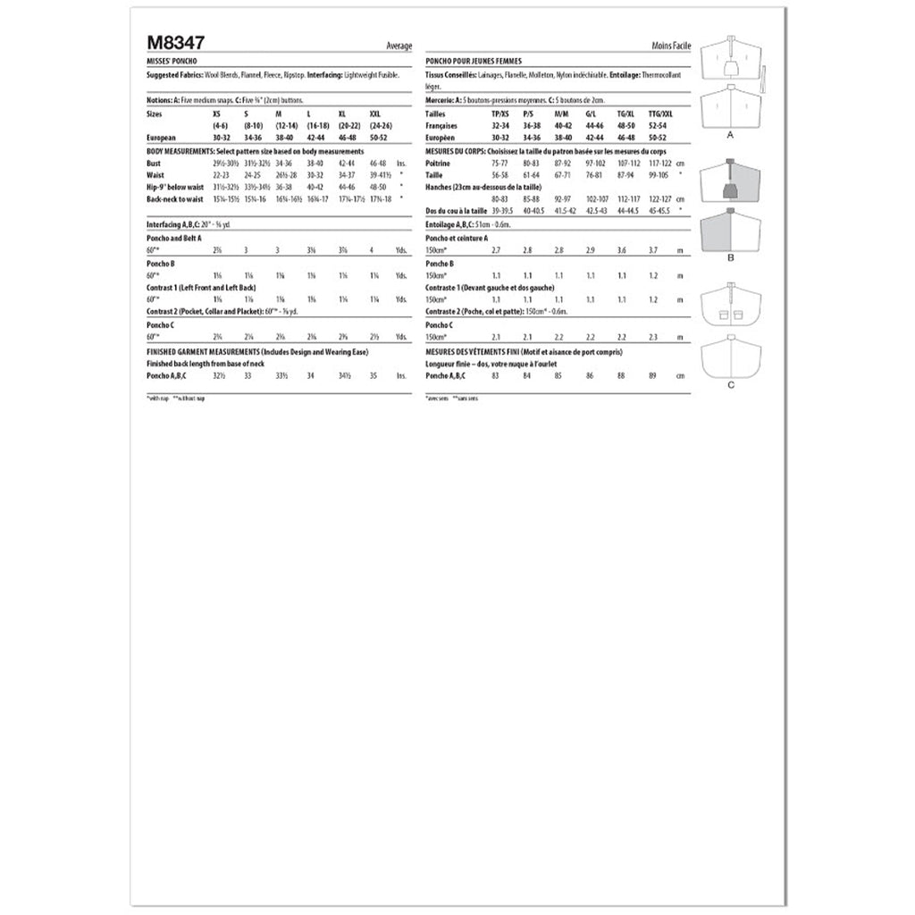 Le motif offre trois options de poncho, parfaites pour jeter par-dessus n'importe quelle tenue. Le modèle A a une patte de boutonnage avec des boutons-pression et une ceinture pour une taille cintrée. La version B a une poche, un col et une patte de boutonnage contrastés sans fermeture. Le modèle C a une patte de boutonnage et des poches à rabat.