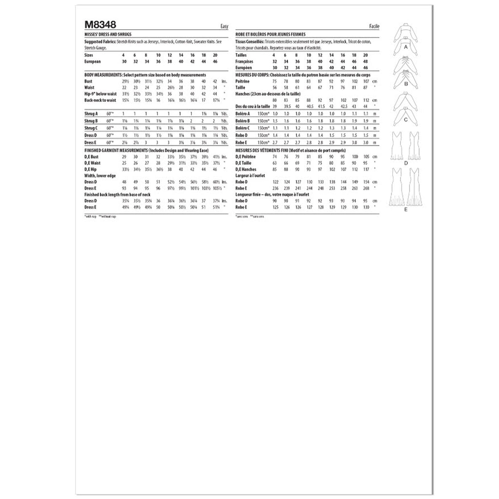 La robe et le haussement d'épaules peuvent être stylés en plusieurs variantes. Les vues A, B et C sont des styles différents de haussements d'épaules. La version A a un col roulé et des manches longues. Le modèle B a un devant croisé. Le modèle C a un col roulé et un cache-cœur. La robe est disponible en deux longueurs et a un col en V devant et dans le dos.