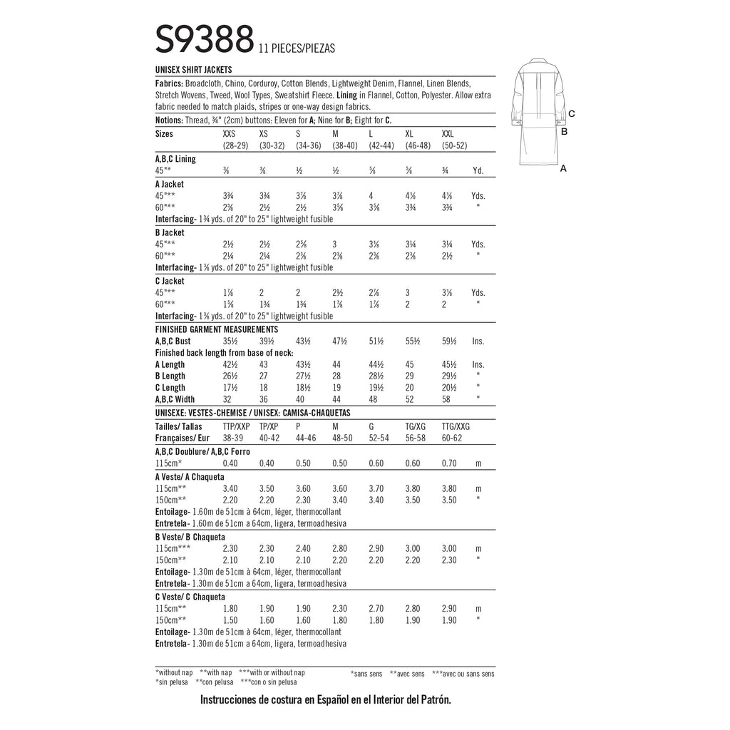Simplicity S9388 Vestes Chemises Unisexes (XXS-XS-S-M-L-XL-XXL)