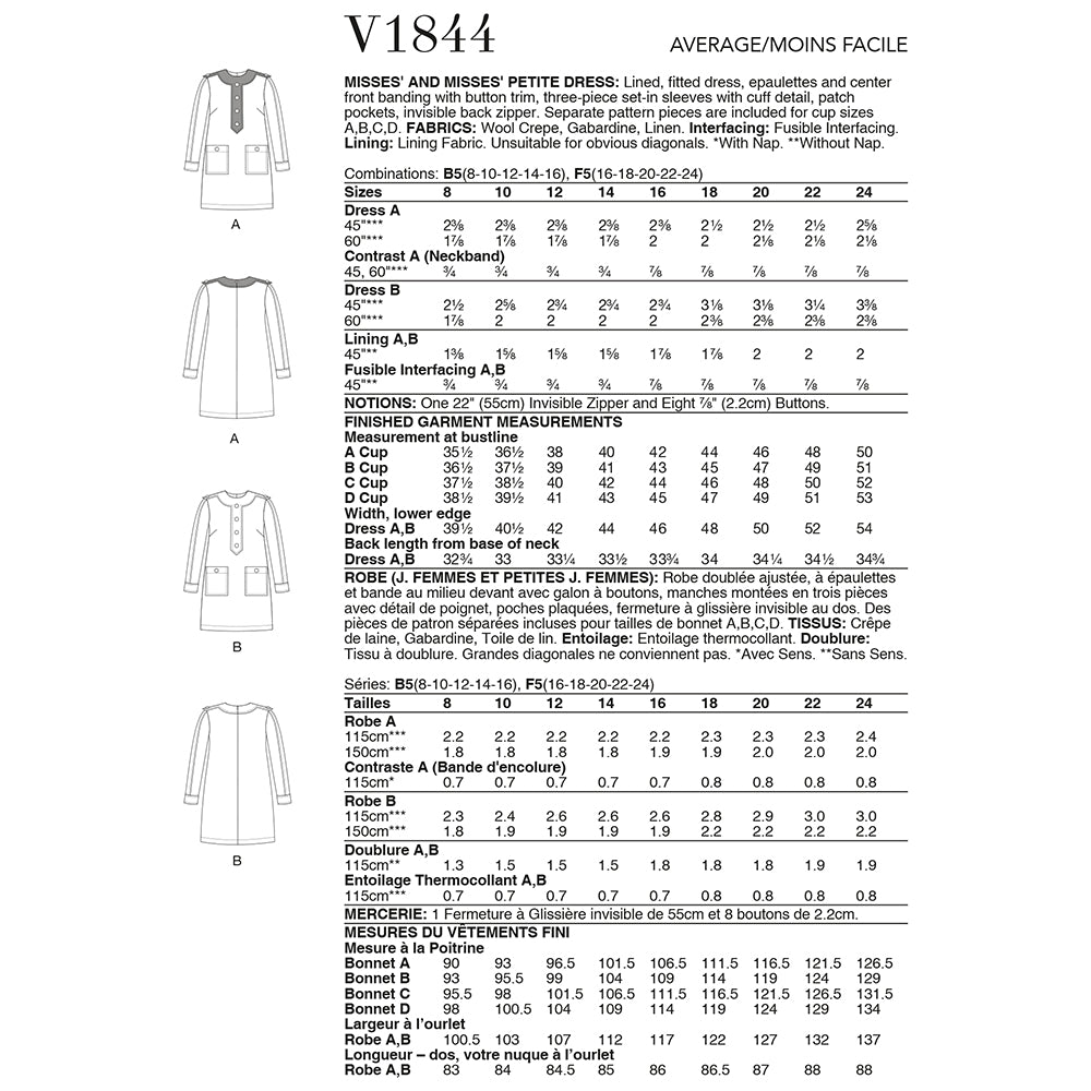 Robe ajustée doublée, épaulettes et bande centrale devant avec bordure boutonnée, manches trois pièces montées avec poignets, poches plaquées, fermeture à  glissière invisible au dos. Des pièces de patron séparées sont incluses pour les tailles de bonnet A, B, C, D.