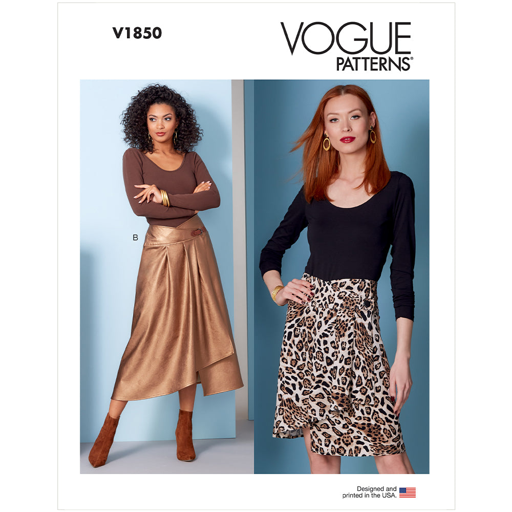 La jupe portefeuille asymétrique non doublée a des plis sur le devant, des surpiqûres, un ourlet cousu, des liens de ruban à  l'intérieur et des variations de longueur. Le modèle A est doté d'une fermeture à  bouton. View B a acheté une fermeture en cuir.