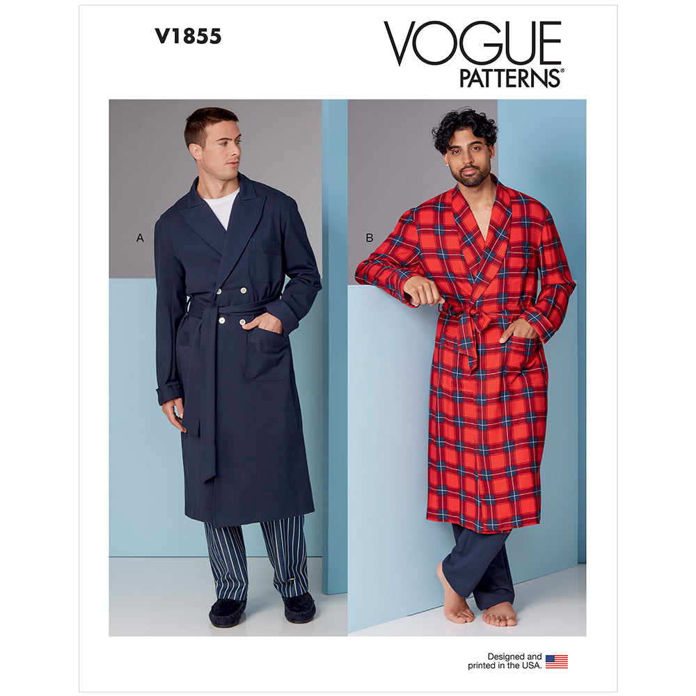 Peignoir ample avec poches plaquées à  bandes, manches deux pièces avec poignets, ceinture assortie, passants de ceinture, surpiqûres. La version A a des revers en pointe. La version B a un col châle.