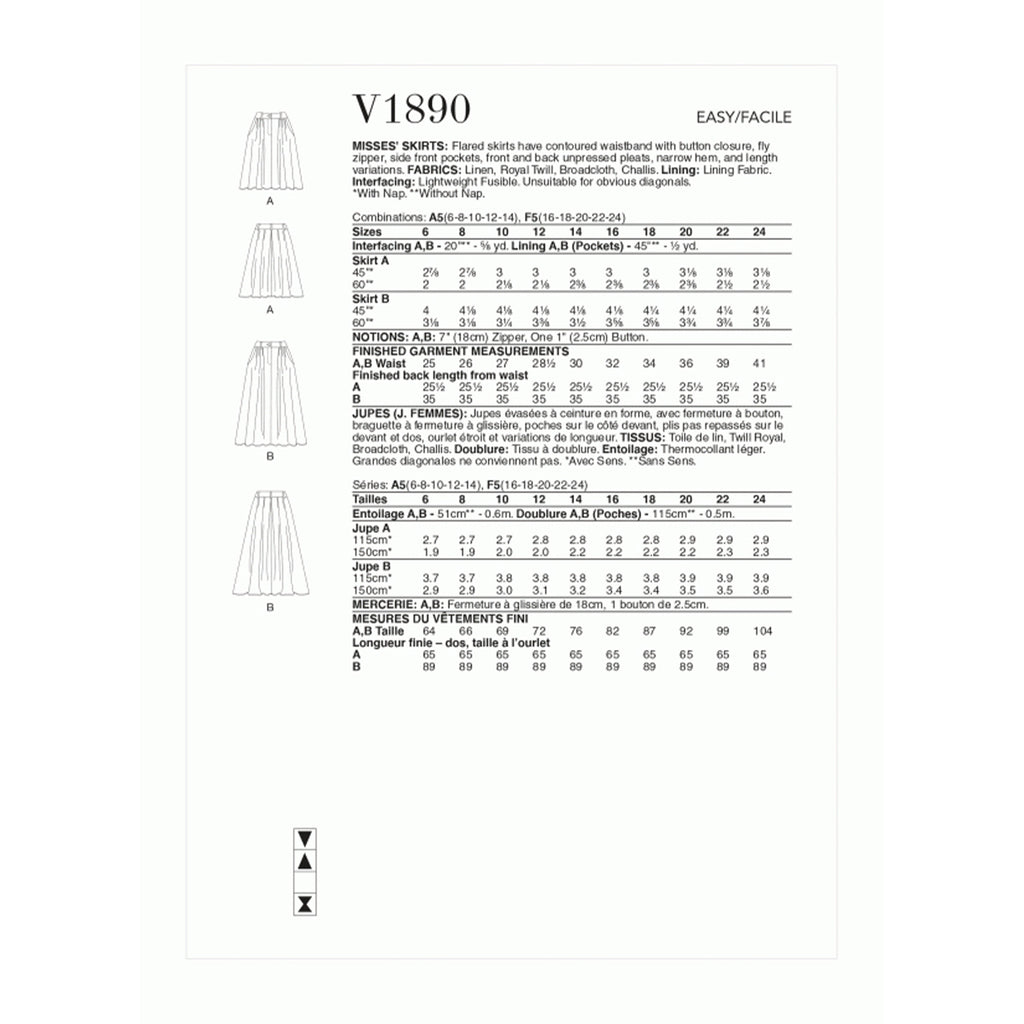 Les jupes évasées ont une taille profilée avec fermeture à bouton, une braguette zippée, des poches latérales avant, des plis non pressés à l'avant et à l'arrière, un ourlet étroit et des variations de longueur. Compétence en couture : facile.
