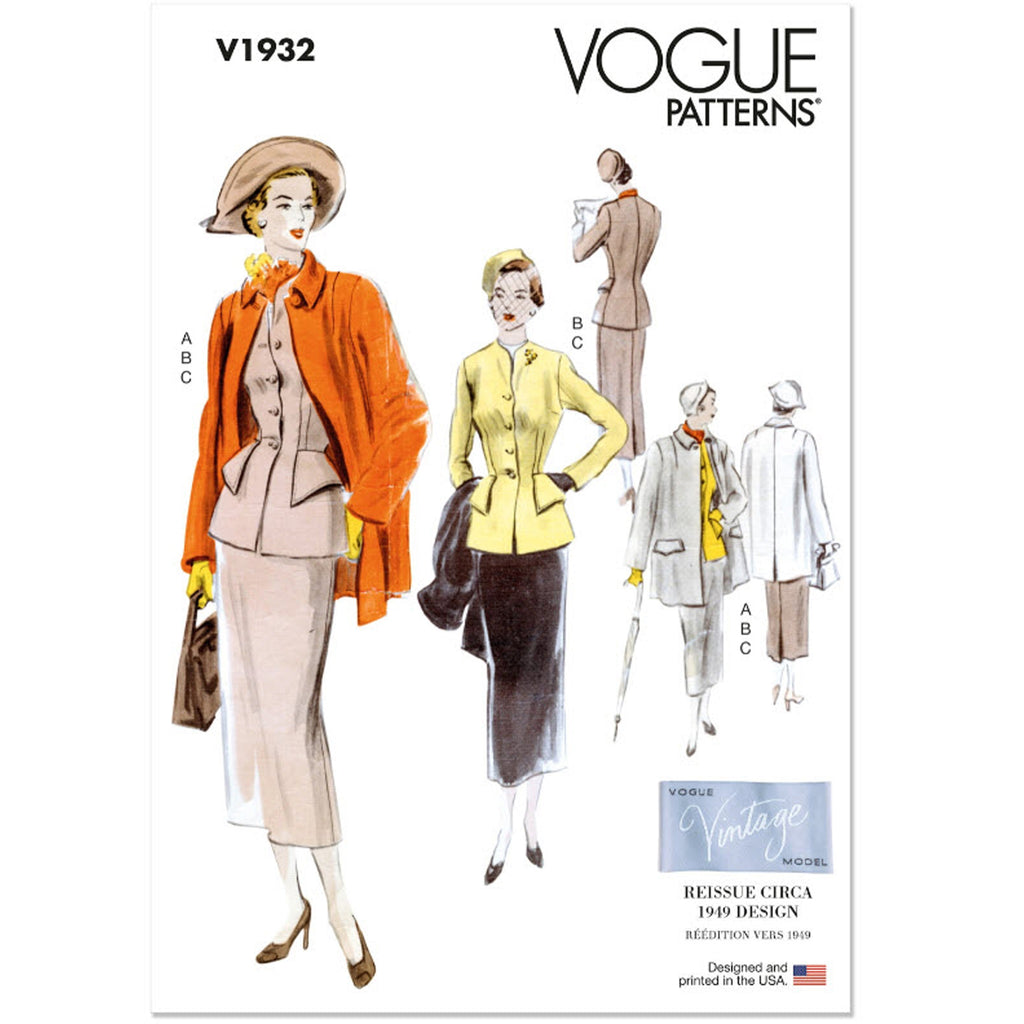 Modèle vintage Vogue vers 1949 Costume et manteau. Veste sans col avec des rabats profonds simulant des poches et des manches longues en deux parties. Jupe trois pièces très fine avec pli au milieu du dos. Manteau droit de longueur trois-quarts avec deux poches à rabat et une fermeture à un bouton au cou, un large col rabattu, des manches droites et une fente au centre de la couture arrière.