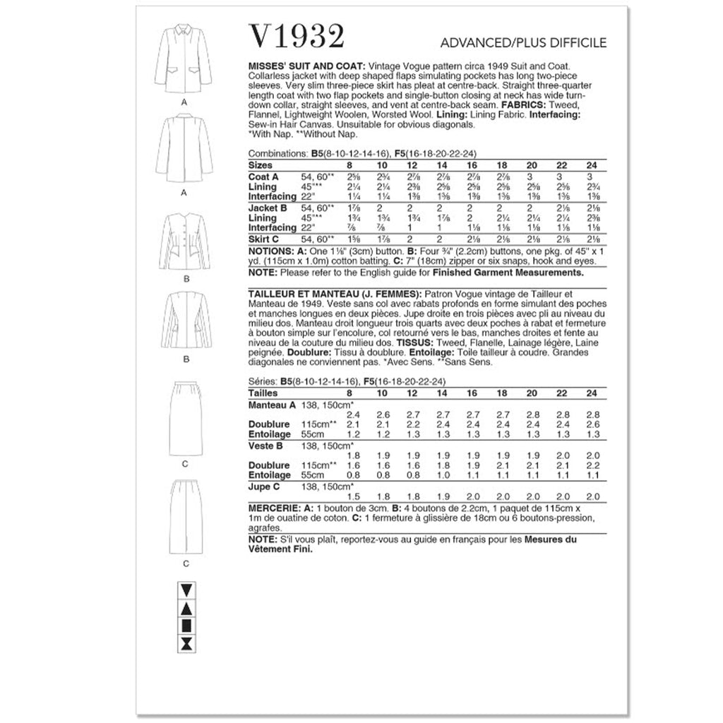 V1932 Costume et manteau vintage pour femme (16-18-20-22-24)