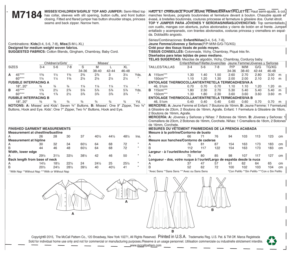 M7184 Misses'/Children's/Girls' Top and Jumper (Size: SML-MED-LRG-XLG)