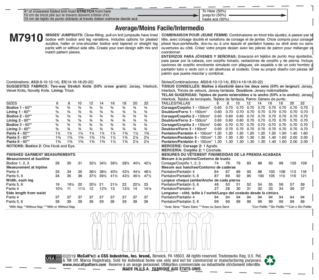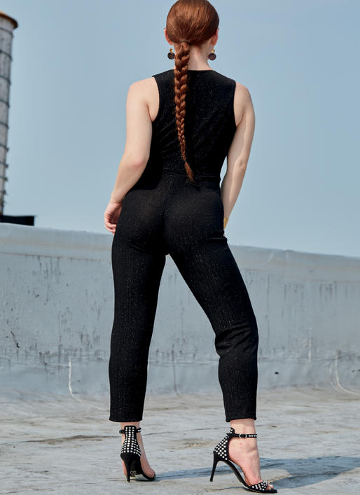 Close-fitting pull-on knit jumpsuits have lined bodice with bodice and leg variations. Includes options for pleated surplice, halter or one-shoulder bodice and tapered or straight leg pants with or without side slits. Create your own design with mix and match pattern pieces.
