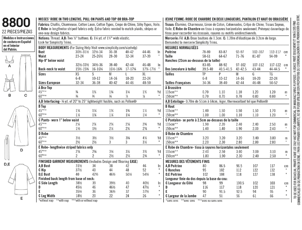 Simplicity S8800 Misses' Robe, Pants, Top and Bralette (XS-XS-S-M-L-XL)