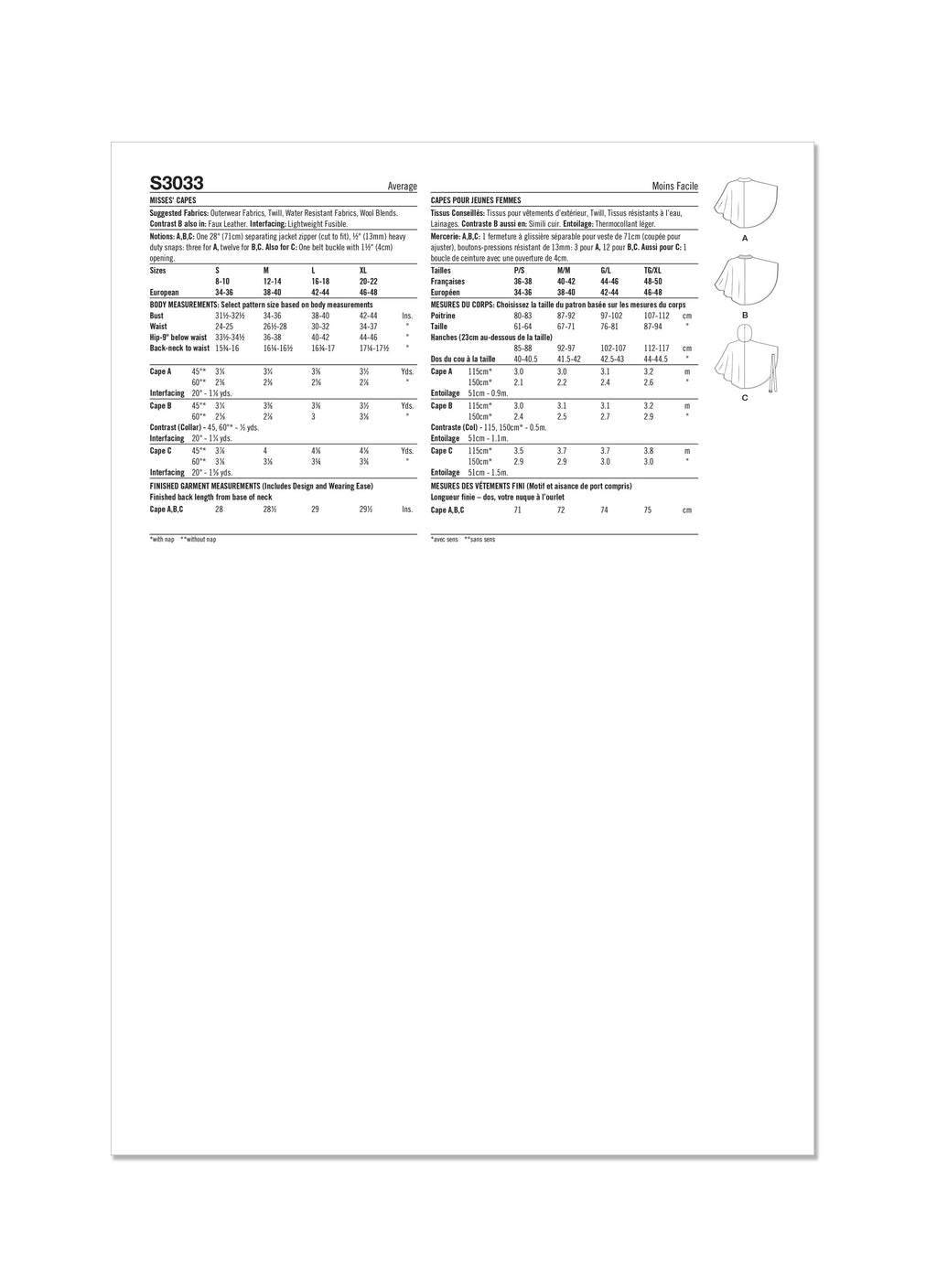 Capes with front zipper opening have patch pockets with flaps and snap closures. Views A and B have collar, View C has a hood and belt with purchased buckle. Views B and C have placket with snap closure covering zipper.