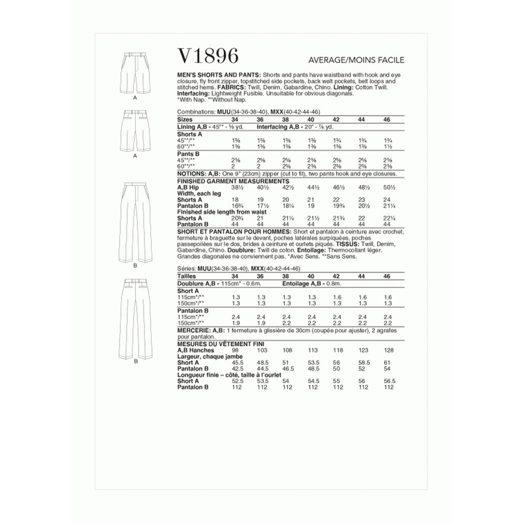 Shorts and trousers have waistband with hook and eye closure, fly front zipper, topstitched side pockets, back welt pockets, belt loops and stitched hems. Sewing Skill: Average.